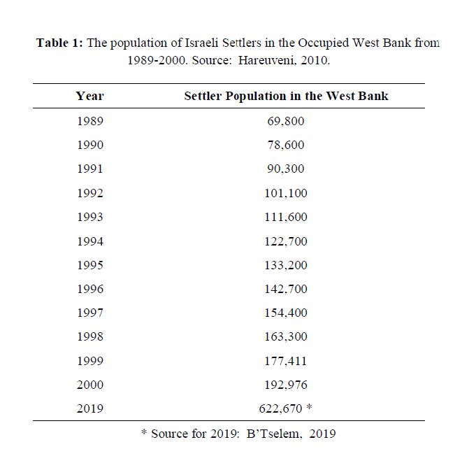 Table 1: The population of Israeli Settlers in the Occupied West Bank from 1989-2000. Source: Hareuveni, 2010.