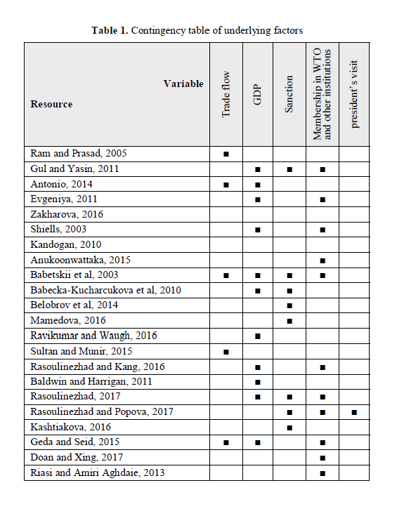 A significant number of studies have investigated bilateral trade flows through various approaches. Idrisov et al. (2016), in a research on 'trade and Russian economic development’ believe that Russia needs structural reforms. This strategy requires a diversification of production and exports in line with sustainability. In this regards, social stability, vulnerability reduction and reducing the impact of variability in terms of trade on the Russian economy should be targeted as the main issues to examine. Mamedova (2016) investigated the trade relations between Iran and Russia. The main obstacles to further expansion of collaboration can be divided into the two categories of “external and internal factors”. These factors include regime of sanction, low energy prices, lack of diversity in Russian and Iranian exports, and lack of a clear program for the promotion of bilateral relations. In addition, Russia and Iran do not have joint banking and insurance institutions, and the level of social and cultural relations remains low. Parand (2016) presented major obstacles to economic cooperation between the two states. These obstacles are as follow: financial transaction and credit line, Russia’s quality standard system, which is not compatible with that of Iran, a strict and complicated procedure for exporting Iranian goods to Russian market, insurance and credit lines for Iranian projects, lack of tariff preferences between the two states, and high rate of customs tariff for Iranian exporting goods. Rasoulinezhad (2017) analyzed “the effects of Russia’s WTO accession on Russia’s foreign trade policy with top 40 trading partners” based on a gravity model. Results indicated that economic size, trade remoteness and bilateral exchange rates have had a stronger effect on industrial trade flows between Russia and its top trading partners before the WTO accession, while economic size, trade remoteness and trade openness seem to have a stronger impact on industrial trade flows after the accession. The results of this research suggest that scholars in future researches could investigate the effects of sanctions. The study of sanctions effects on Russian trade pattern is one of the recommendation proposed by this research. Riasi and Amiri Aghdaie (2013) conducted a research on the “Effects of a hypothetical Iranian accession to the World Trade Organization on Iran’s flower industry”. The statistical population consisted of four different groups including flower producers, flower exporters, flower importers, and flower distributors. Results indicated that the performance of several industry factors would be increased under Iran’s accession to WTO. These factors are as follow: “direct foreign investment, the competitive strength of flower exporters, related job opportunities, and the number of international flower distribution companies in Iran” (Riasi & Amiri Aghdaie, 2013, p. 102).