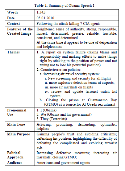The press conference was held on 05.01.2010 regarding measures taken following the terrorist attack by Humam Khalil Abu-Mulal al-Balawi on 30 December 2009. The speech develops two themes: failure of the security apparatus, for which Obama takes full responsibility, and orders his team to find the reason for the failure via a thorough review of security, and of the government’s counterterrorism policies. His speech mainly addresses ‘the Americans and the government agents’. One of the features of this text is lack of the use of the pronoun we (Obama and Americans) and significant use of pronoun I, followed by strong verbs. While this pronoun was also found in the first text, the use of I is highlighted and centralized in the second speech. Other forms of pronouns used are we (the government) and they (terrorists).
