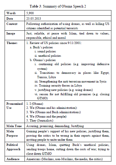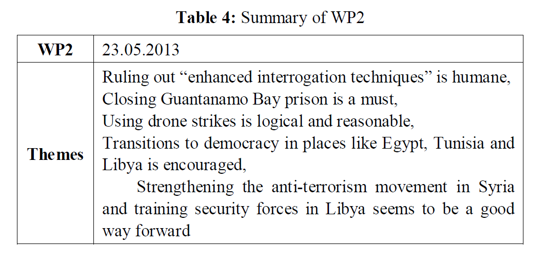 This address was delivered on 23.05.2013. It was at a time when Obama was under criticism for being the first president who authorized the killing of US citizens identified as potential terrorists, as well as for authorizing drone strikes, which were said to be inexact and imprecise and would lead to civilian deaths. The speech has special features not found in the previous text (Text 1). For instance, the length of the speech and its detailed explanatory language – (i) to denounce some of Bush’s counterterrorism policies, i.e. a feature that was missing in previous texts but was suggested by both WP1 and WP2, (ii) to explain the reasons of not accomplishing a number of policies promised by Obama in previous speeches, and (iii) to justify Obama’s new policies – make this speech unprecedented. Moreover, introducing the two themes of ending the traditional war and beginning a new war — as suggested by WP1 and WP2 — as well as addressing new groups including the media, the critics, and Muslim American citizens are two other special features of this speech as will be discussed below.