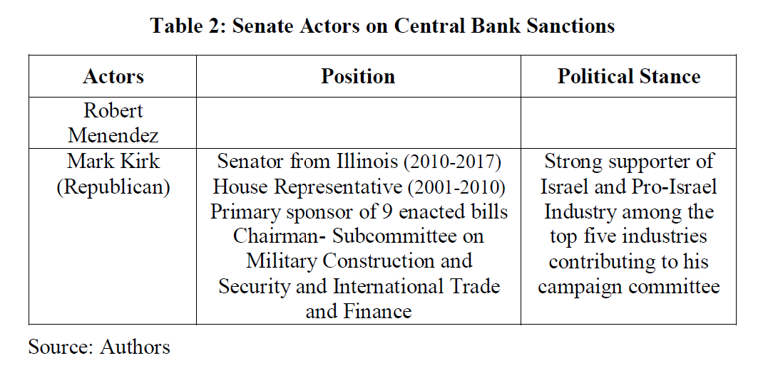Table 2: Senate Actors on Central Bank Sanctions