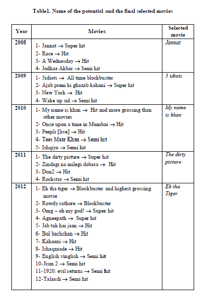 For choosing the films, the author first searched via the keyword “box office of Indian movies,” and found several websites, among which three were chosen. Box Office India is an Indian website designed only for Indian movies; Koimoi includes movies from both Bollywood and Hollywood, but the focus of the site is on Bollywood and is an Indian website. Finally, IMDb is a non-Indian reliable international website. Comparing all three websites, the results of the grossing and verdict of a movie in all of them were the same.