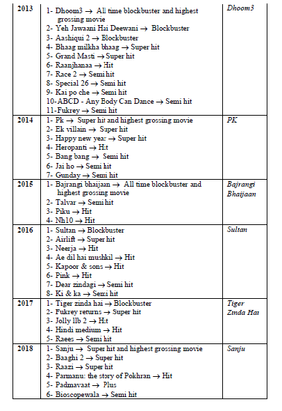 1- Tiger zinda hai ® Blockbuster 2- Fukrey returns ® Super hit 3- Jolly llb 2 ® Hit 4- Hindi medium ® Hit 5- Raees ® Semi hit |
