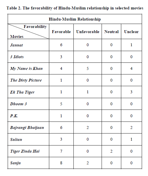 Table 2. The favorability of Hindu-Muslim relationship in selected movies