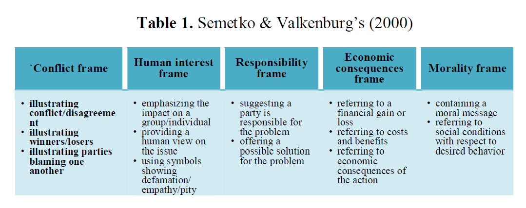 Semetko and Valkenburg (2000) investigated the following five news frames identified in earlier studies: