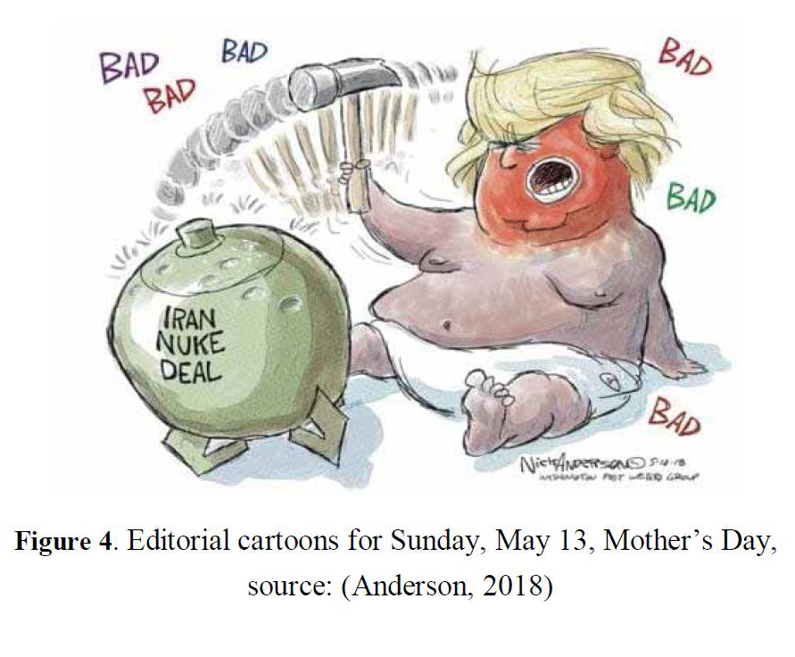 This study focuses on editorial cartoons concerned with Trump’s withdrawal from the JCPOA. A multilateral agreement between Iran and the five permanent members of the UN Security Council and Germany, the JCPOA was supposed to resolve 'the Iran nuclear dossier' for the parties involved in the negotiations. Breaking decisively with US allies in Europe, Trump’s withdrawal from the JCPOA significantly impacted other parties including the leaders of the UK, France and Germany, who were parties to the agreement.