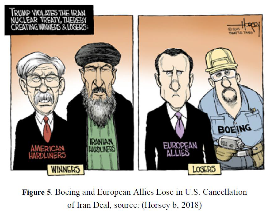 As discussed earlier, many cartoons refer to Trump alienating US partners while aligning himself with “hardliners” in both US and Iran (Horsey, 2018 b). Accordingly, Figure 5 shows “European allies”—represented by the French President Macron—and a Boeing employee as the losers of the deal withdrawal, referring the expectation of several parties that economic and political ties with Iran would be expanded after the JCPOA. The despairing Boeing figure is a reference to the largest of Boeing’s deals with Iranian airlines—announced in December 2016, worth about $20 billion, and envisaged to replace Iran’s old commercial airplanes (Sheetz & Josephs 2018)—cancelled after Trump’s withdrawal.