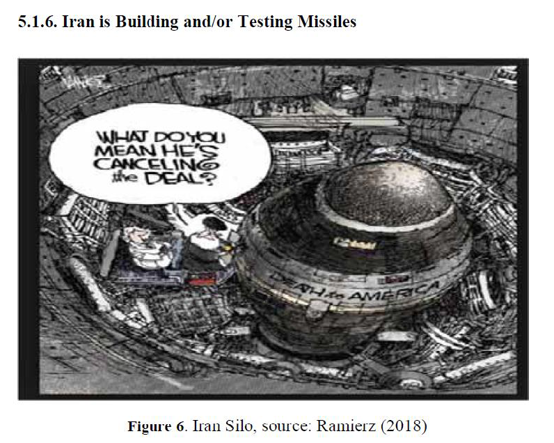 Other cartoons show Iran as untrustworthy, even while criticizing Trump’s policy toward Iran. The latter is depicted as a theocratic state (accentuated by depicting Iranians solely as clerics, even in a nuclear silo) and a state sponsor of terrorism which is either making a nuclear bomb or a missile. The cartoon shown as Figure 6 creates the impression that Iran is making a nuclear bomb (a claim the country has rejected several times and refuted by the IAEA’s repeated confirmations that Iran is meeting its JCPOA commitments) despite the deal and that it has not ceased its alleged former activities. In a similar vein, other cartoons portray the Iranian supreme leader standing on a Persian carpet, holding missiles with the Iranian flag imprinted on them, as Trump pulls on the carpet to cause him to fall (Cagle, 2018) or a similarly turbaned figure carrying a nuclear bomb ready to explode while Trump foolishly and playfully burns a document labelled “Iran deal” (Chappatte cited by Heraldnet Editorial Staff, 2018).