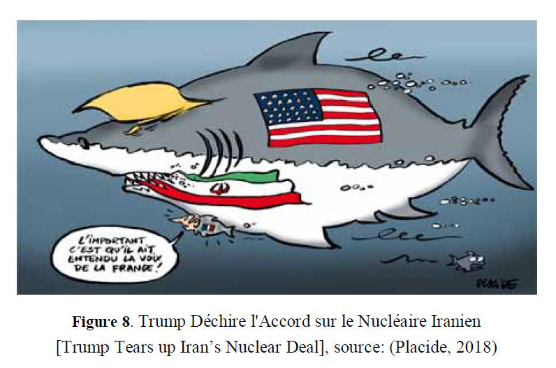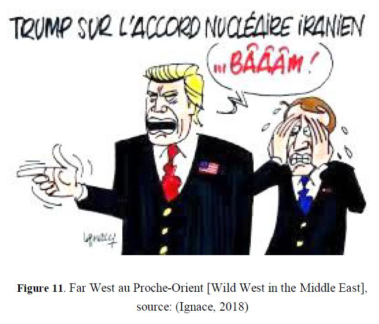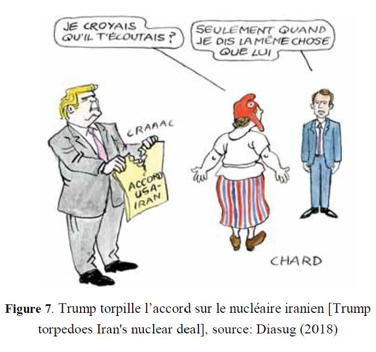 In the French cartoons analyzed, Trump’s decision to withdraw from the JCPOA is considered as an act against French interests which requires a reaction from French politicians who appear powerless in this matter. It can be argued that the JCPOA, an agreement negotiated by P5+1 countries, was framed mostly in the French media as a Franco-American interaction, including in the reaction of the French president vis-à-vis Trump’s withdrawal. This shows how concerning American unilateralism is for the French media and dominant conflict is in Franco-American relations, particularly in the Trump era.