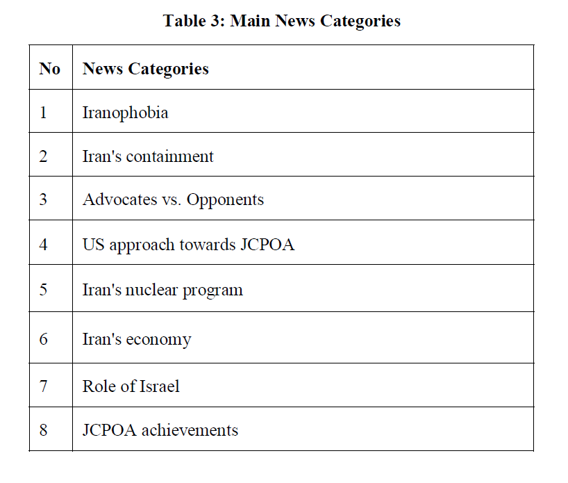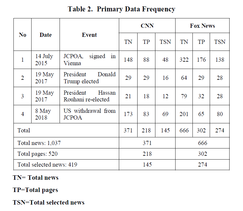 Due to the low frequency of the term the JCPOA – as the most significant keyword- to identify the relevant transcripts, other keywords such as “Iran deal”, “Iran agreement” or “Iran nuclear negotiations” were searched. Obviously, when the keyword is too broad to cover the targeted news, many other irrelevant subjects, words and headlines are expected to come up. Finally, by searching “Iran” as the keyword, out of 1,037 total news, 419 pieces of news relevant to the JCPOA were found. This includes 145 cases for CNN and 274 for Fox news as shown in Table 2.