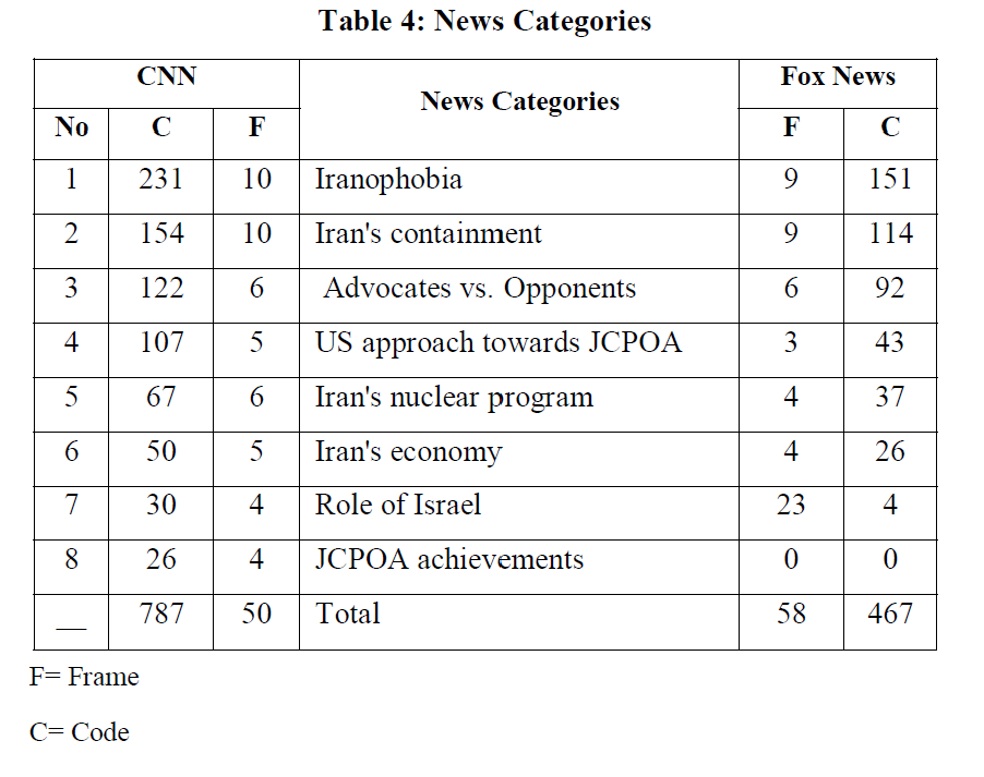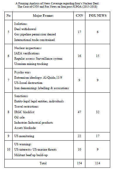 Using framing as the study’s methodological and theoretical framework, the paper analyses CNN and Fox News’s approach toward the JCPOA within four major events during the period from July 14, 2015 to May 8, 2018. This paper addresses three major questions with regard to framing Iran after the JCPOA. In order to answer the first research question regarding the ways in which CNNand Fox Newdepicted/framed Iran in general, and Iran’s nuclear deal in particular, an inductive approach was used to derive the list of frames from the corpus of analysis. Eight frames (i.e., Iranophobia, Iran’s containment, advocates vs. opponents, US approach toward the JCPOA, Iran’s nuclear program, Iran’s economy, the role of Israel, JCPOA’s achievements) were derived based on the frequency of the themes in CNN and Fox News, which reflect the two media’s political attitudes toward Iran in general and Iran’s nuclear agreement in particular.