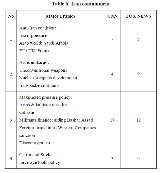Similar to CNN, Fox News, which represents conservative views of the US administration, clearly zooms on the frame of “containment” to pretend the way in which the strategy would effectively deter Iran from nuclear ambitions as “the Trump administration has a strategy to deal with geopolitical challengers … especially those who want nuclear weapons… It’s called containment” (Kazianis, 2018b). Elsewhere, CNN highlights an “Anti-Iran coalition” framing by putting Iran on one side and “ Israel and Arab world” on the other, stating that “He [Trump] will travel to Jerusalem and Riyadh, Saudi Arabia where he is expected to reassure Israel and America's Sunni Gulf allies that his administration is committed to containing and deterring Iran” (Weiss & Hassan, 2017). This statement could be characterized as a multi-frame combination and considered as the most challenging issue in a holistic account of the corpus data analysis. The issue semantically implies a string of justified measures mostly determined by US officials against Iran. The definition metaphorically manipulates the audience to view Iran as a rogue state that has to be blamed by the hegemonic powers due to its US-claimed atrocities. Additionally, containment is one of the most frequent frames (in terms of quantity and quality), which includes the longest cluster of codes and sub-codes. This implies that through persuasive effects, the US administration attempts to influence public opinions, as illustrated in Table 6.