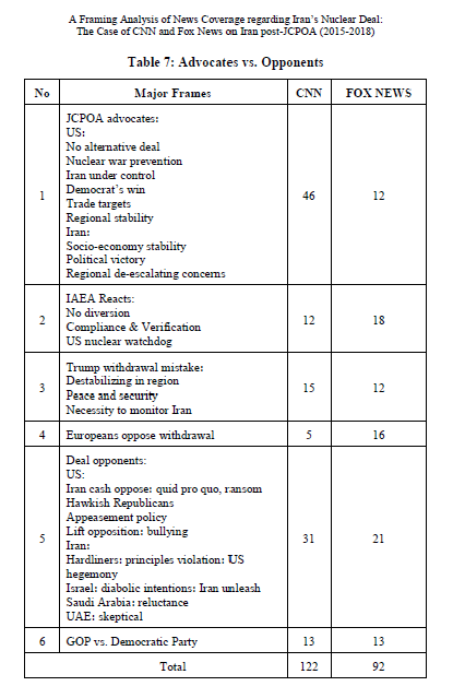 This analysis indicates that the JCPOA does not move to establish peace and security in the region; on the contrary, it pushes Iran to become more violent against American interests and those of its allies. Fox News believes that, “Iran’s seeking many billions of dollars in ransom to free US hostages” (Kredo, 2016). Contrary to these hawkish stances, CNN, as the pacifier dovish, rather states, “Iran unleash” as “Democrats -- and some Republicans -- unhappy with Trump's decision to withdraw from Iran deal” (Diaz & Fox, 2018). The resulting figures of the major frames of the two media on the “JCPOA advocates vs. opponents” are relatively equal, as outlined in Table 7: