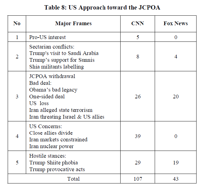 While CNN says "there is no other better way to prevent Iran from moving covertly to build a nuclear weapon" (Collinson, 2015), Fox News portrays Iran as "a rouge country in pursuit of possessing nuclear power […] firing missiles into American locations [….] terrorist acts in the Middle East, and threatening Israel (Weber, 2018). Table 8 illustrates the US approach toward the JCPOA in CNN and Fox News.