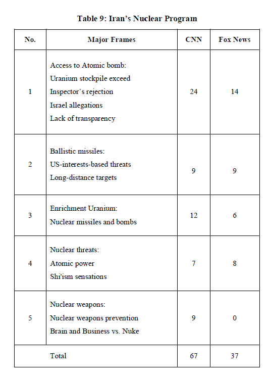 Elsewhere, Fox News underscores that the agreement is designed to slow or halt any attempt by Iran to “produce nuclear weapons”, in exchange for the lifting of economic and other sanctions by the United States and other countries. The analytical framing indicates that despite the fact that the agreement is assumed to be a win-win deal by most of the US Democrats, one could still hear and find many opponents and hostile voices in the US foundations institutions to consider it as blackmail granted to Iran. Once the audience is manipulated with the framing impacts, the media can claim that the mission of shaping the public views is accomplished. Under the effects of negative framings about Iran and its nuclear activities, public opinions might get skeptical that the JCPOA is a real threat that would consequently result in the development of an atomic war. In a conclusive bipartisan analysis, which is politically constructed from the two sides, CNN believes, “to debate on Iran, one side was a strikingly broad consensus of nearly the entire arms control community on the opposing side, the Iran hawk community, is finding ways to isolate and ultimately destroy Iran's clerical regime, by military force if necessary, nuclear program or not” (Logan, 2015). As portrayed in the US leading media, the issue of the JCPOA has been framed in a way that the diplomatic approach should be based on explicit incentives and threats to stop the deadly destruction of nuclear proliferation. Fox News believes that “the Iran deal is dead -- Iran killed it” (Timmerman, 2018). Generally, Iran’s nuclear program has been framed relatively through the impacts of framings as “access to the atomic bomb,” “ballistic missiles,” “nuclear threat,” and “nuclear weapon.” Table 9 illustrates the above-mentioned arguments: