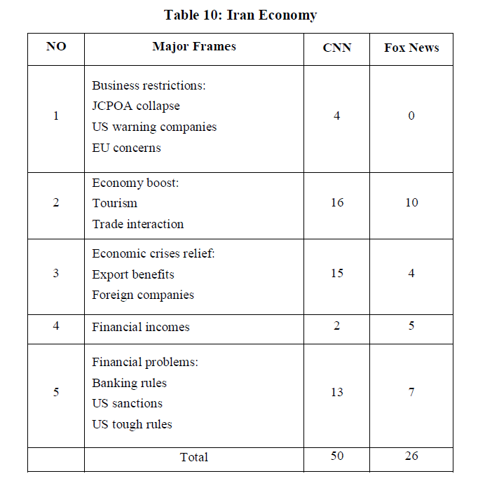 This news category unveils another significant frame titled “Iran’s economy”, which has been placed at the sixth place among the frames extracted in this paper. In fact, frames “reside in the news narrative’s specific properties,” such as the keywords, symbols, metaphors, and images that inspire those thinking about an event to perceive and understand it in a particular way (Entman, 1991). Therefore, the titles under the sub-framing of “business restrictions”, “economy boost and relief” as well as “financial incomes and problems” overwhelm the triumph of the JCPOA by using “trade interaction” and warning of “sanction” to once again maintain the policy of “carrot and sticks” as a mean for threatening the future of the pact. According to Fox News, "European powers say the Islamic Republic 'not meeting' terms, threaten more sanctions” (Norman, 2018). To pacify the nuclear debates over Iran’s agreement, CNN underscores “essential idea behind the deal is that in exchange for limits on its nuclear activities, Iran would get relief from “sanctions” while being allowed to “continue its atomic program for peaceful purposes” (Rocha & Wagner, 2018). Generally, the major frame under “Iran’s economy” is expected to analyze the issue from different points of view, especially in the framework of motivational themes that have constructed the economic perspectives of the JCPOA. Additionally, CNN takes the bright side of the agreement to frame “optimism as Iran nuclear deal framework announced” (Labott, 2015). Fox News refers to Iran’s challenging economy, reporting that “their economy can be held back in isolation for years – perhaps decades as they won’t be able to get rich selling oil or gas” (Kazianis, 2018a).