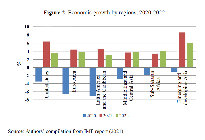 However, the loss of human lives due to the COVID-19 only reveals half of the picture of the current pandemic’s impacts, which has had serious socio-economic short-term and long-term consequences, which have altered the life style and the political and economic priorities of a country, as well as its foreign relationships, divergence and convergence from and with different countries. Undoubtedly, the ongoing coronavirus pandemic has disrupted the global economy in terms of both supply and demand chains at a large-scale due to imposing certain restrictive measures, such as closing factories, reducing production, and limiting the mobility of work labor. Such measures have contributed to recession and relentless falls in foreign trade volumes in various heavily affected industries, including travel and tourism industries. Furthermore, according to a study by Maliszewska, Mattoo & Van Der Mensbrugghe (2020), major economic systems have lost considerable proportions of their gross domestic product (GDP), up to 3.9%, while developing countries have been hit the hardest (4% on average, but some of them had over 6.5%). Therefore, adopting protectionist actions by governments to offer support is not far-fetched. Relying on different policies, such as trade de-liberalism and increasing restrictions to free capital and trade flows are considered as essential strategies to provide economic growth recovery. According to World Economic Outlook published by IMF (2021), thanks to the anti-liberal policies of the governments, the short-run economic growth would have positive results for all regions. As shown in Figure 2, by the year 2022, the Euro Area, the Latin America and the Caribbean regions, the Middle East, and Central Asia will experience a growth of economy, nearly 3.5%, while emerging and developing Asian nations will reach a higher economic growth, approximately 6%, by this time.
