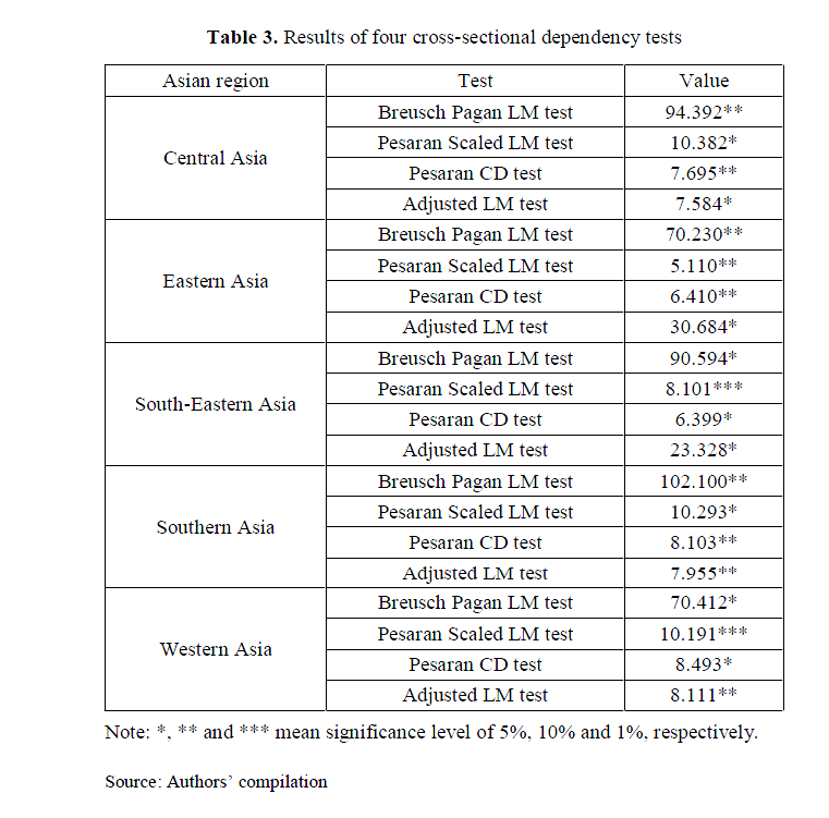 To find out the relationship among the above-mentioned variables, the GMM (Generalized Method of Moments) was employed. Prior to proposing the estimations, it is necessary to check the existence of cross-sectional dependency and unit root among these variables. To this end, we employed four cross-sectional dependence tests, including the Lagrange Multiplier (LM) of Breusch and Pagan (1980), Scaled version of LM test of Pesaran (2004), CD test of Pesaran (2004), and the modified version of LM test proposed by Pesaran & Yamagata (2008). In addition, the panel unit root tests of IPS (Im, Pesaran & Shin, 2003), LLC (Levin, Lin & Chu, 2002), and CADF (the Cross-Sectional Augmented Dickey Fuller) (Pesaran, 2007) were used. It should be mentioned that as a robustness check, the Ordinary Least Squares (OLS) technique was employed to estimate the coefficients for country level in five Asian regions.