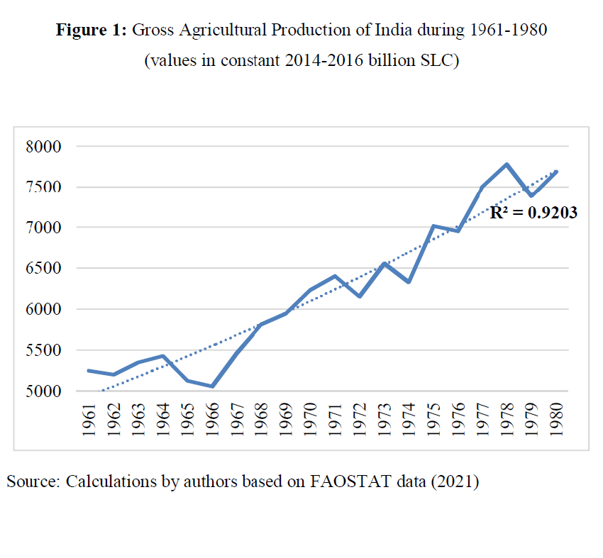 Irrespective of the foreign motivations behind the Green Revolution and the extent to which these motivations played a role in the political economy of Indian agriculturalism, an outstanding point to argue relates to the concept of localization of the new technologies. As argued by Parayil (1992), the technology became compatible with the economic, social, and physical conditions in India first, and was then welcomed by the peasant farmers and caused irreversible changes in economic and social factors. The changes, for instance, include a constant increase in agricultural production (Figure 1).
