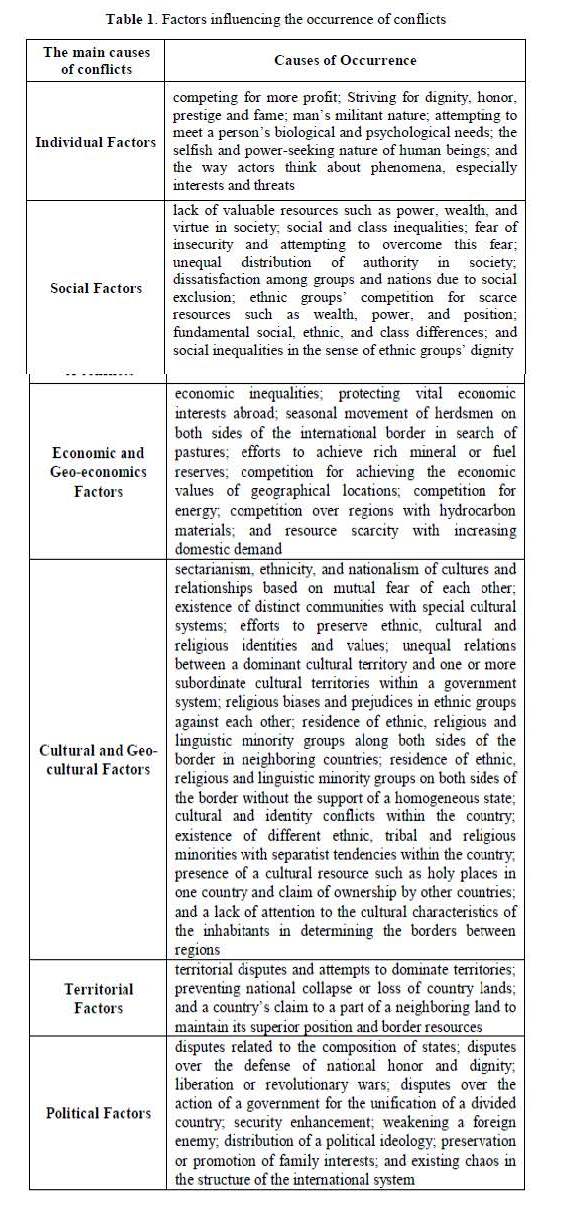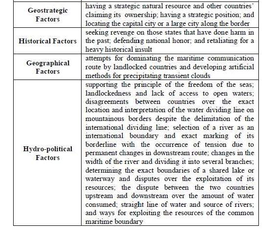 According to these views and theories, the main causes of conflicts in 10 groups of Individual, Social, Economic and Geo-economics, Cultural and Geocultural, Territorial, Political, Geostrategic, Historical, Geographical and Hydropolitical factors include the elements illustrated in the following table (Mirzaei Tabar et al., 1396 [2018 A.D.], pp. 170-172):