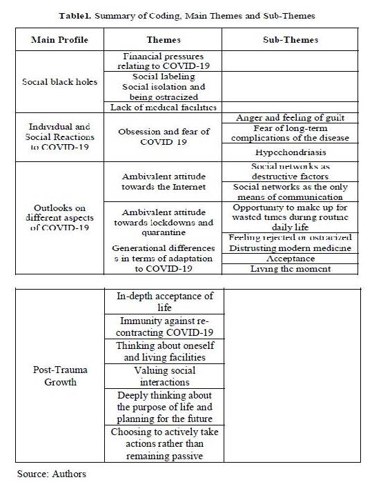 The profile of the main components of the participants COVID-19 experiences were formed in terms of social black holes (financial pressures due to the disease, social labelling, being ostracized, and lack of medical facilities), individual and social reactions to COVID-19 (hypochondriasis or illness anxiety), outlooks on the different aspects of COVID-19 (ambivalent attitudes towards the Internet and quarantine, generational differences in terms of adapting to COVID-19), as well as post-trauma growth (in-depth acceptance of life, immunity against re-contracting COVID-19, thinking about oneself and living facilities, valuing social interactions, deeply thinking about the purpose of life and planning for the future). Each aspect of the profile has guiding themes that explain the profile of the main components. The following table illustrates the main profiles and their themes.