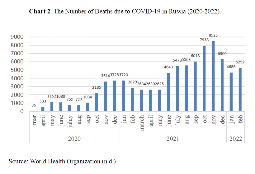 Although Russia is the first country to produce the COVID-19 vaccine, its poor performance in epidemic management has made the country vulnerable. Only about a third of Russians are fully vaccinated against the Coronavirus. Public skepticism and mistrust about the efficacy and safety of Russian-made vaccines have exacerbated the problem. According to the Guardian (2020, in Oxenstierna, 2021, p. 16), in December 2020, Deputy Prime Minister Tatyana Golikova abruptly admitted that 81% of the deaths recorded in Russia from January to November 2020, namely 227,700 cases, were due to deaths from COVID-19. That is 186,000 deaths, three times the official figure reported to the World Health Organization for 2020. This figure means that Russia has the third highest number of Corona-related deaths among all countries. There was no explanation for this and no change was made in the official information.