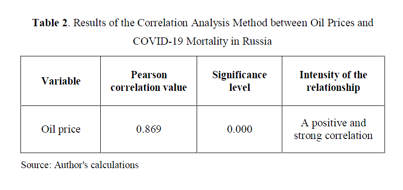 In this section first the relationship between oil prices and COVID-19 mortality in Russia is examined. According to Table 2, there is a positive and strong correlation between these two variables. This means that both the Coronavirus shock and the oil shock occurred simultaneously in Russia. Accordingly, in order to investigate the impact of these two shocks on the Russian economy, first the relationship between Coronavirus mortality and Russian economic variables was examined (Table 3) and then the relationship between these variables and the oil shock was examined, the results of which are presented in Table 4.