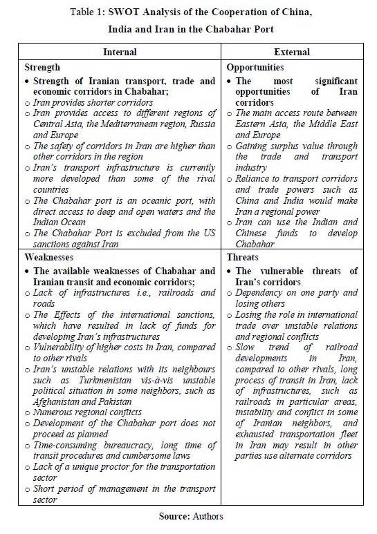 The role of the Chabahar Port in international trade, as well as the opportunities to cooperate with China, could be examined through the SWOT analysis (Fallahfaal & Kiakojouri, 2021), which consists of investigating the strengths, the weaknesses, the opportunities and the threats regarding a phenomenon. To SWOT analyze the cooperation of China, India and Iran in the Chabahar port, one should focus on the strengths, weaknesses, opportunities and threats of the transit corridors in Iran, rather than only Chabahar, as the operation in the Chabahar port is critically dependent on the transit roads and the geopolitical position of Iran in the region.