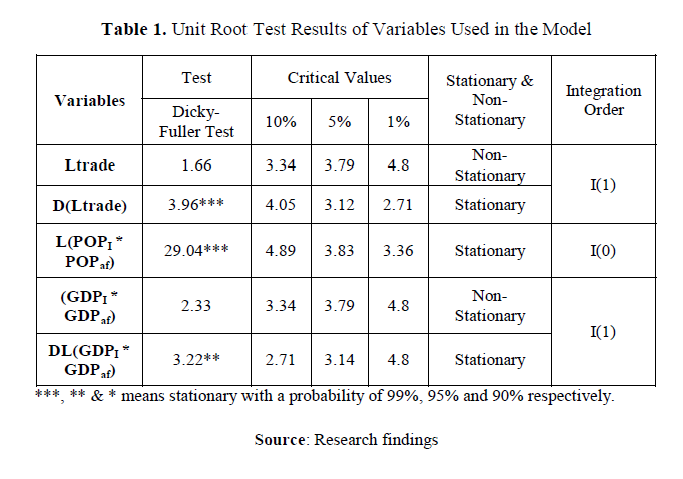 Most econometric methods are based on the assumption that the time series can be rendered approximately stationary through the use of statistical transformations. Non-stationary time series data lead to poor understanding and forecasting—no logical relationship with each other and the estimated regression will have a high R2. Therefore, in order to manage the spurious regression, a unit root test is performed. The results of the unit root test for the variables used in estimating bilateral trade between Iran and Afghanistan are reported in Table 1 below. The table illustrates that the product of population is stationary at level (integrated of order 0, denoted by I(0)). The bilateral trade and GDP variables are stationary after taking first difference (integrated of order 1, denoted by I(1)).