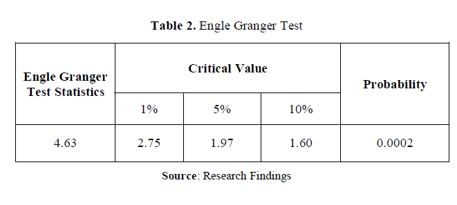 If two variables, for example and are both ∼I(d), a linear combination of these two variables such that in general, will also be ∼I(d). However, it is an exceptional case if the constant θ yields an outcome where ∼ I(d-a) and a>0, then and will be cointegrated. The result of the cointegration test is illustrated in Table 2. The table indicates that the residual of the regression does not have a single root; it can therefore be concluded that there is a long-term relationship (co-integration) between the variables.