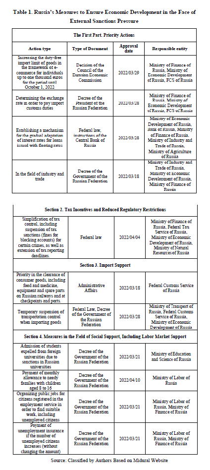 Russian researchers have conducted a range of studies regarding the examination of Russia's response to Western sanctions, particularly the recent and stringent sanctions imposed in response to Russia's special military operation in Ukraine: Ivanov and Bukhvald (2022) in their article titled "Sanctions and Countermeasures in the Russian Economy" delineate Russia's counter-sanction strategies into two distinct categories: defensive and retaliatory actions. Their research findings reveal that Russia has actively pursued defensive and protective measures aimed at fortifying its internal conditions and reducing vulnerability. These measures encompass support for small and medium-sized enterprises through tax incentives and other financial mechanisms, along with collaborative financing of projects and investment agreements intended to bolster domestic production and substitute imports. The authors also underscore the importance of implementing anti-sanction regulations at the federal level, emphasizing the need for close cooperation between federal authorities and local government