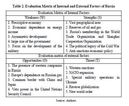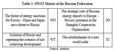 Table (3) presents the results obtained through the application of the SWOT matrix strategy, which involves a comprehensive assessment of Russia's strengths, weaknesses, opportunities, and threats.