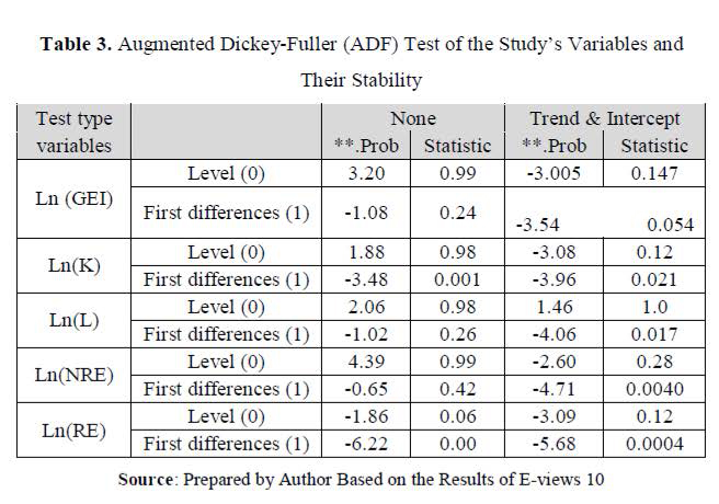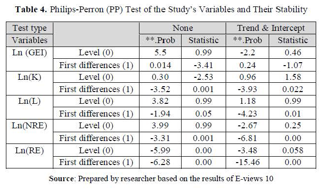 Econometrics assumes that the variables are stable in mean and variance, so the stability of the variables used in measurement must be studied. Where performing regression using the method of least squares "OLS" without ensuring the stability of the variables leads to what is known as Spurious Regression, and the stability of the variables or time series (Brockwell & Davis, 1996) can be confirmed by applying the Augmented Dickey-Fuller (ADF) test and Phillips Perron (PP) test, which are known as unit root tests using fixed limit and time. The two tests differ in that in the first one, the data is assumed to be homogeneous and parametric, while the second test assumes that the data is non-parametric (Jain & Chetty, 2020) and the PP test takes into account errors with heterogeneous variance; Where these tests were applied on each variable separately, we reached the results shown in the table 3 in appendix. From this test, it can be noticed that the time series are all unstable at the level, which means there is a unit root problem (Prop** > 0.05), and these variables became stable after making the first differences, and they became integrated of the first degree (Prop**< 0.05). This is due to the nature of these variables; These variables had many fluctuations during the study period due to the increase in the study period.