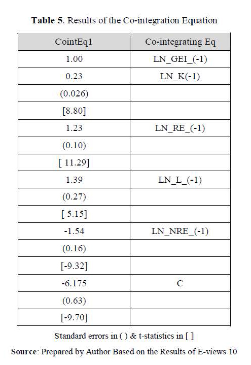 LN_GEIt-1 = -6.17 +0.23 Ln Kt-1 + 1.4 Ln Lt-1 + 1.24 Ln REt-1 – 1.55 Ln NREt-1