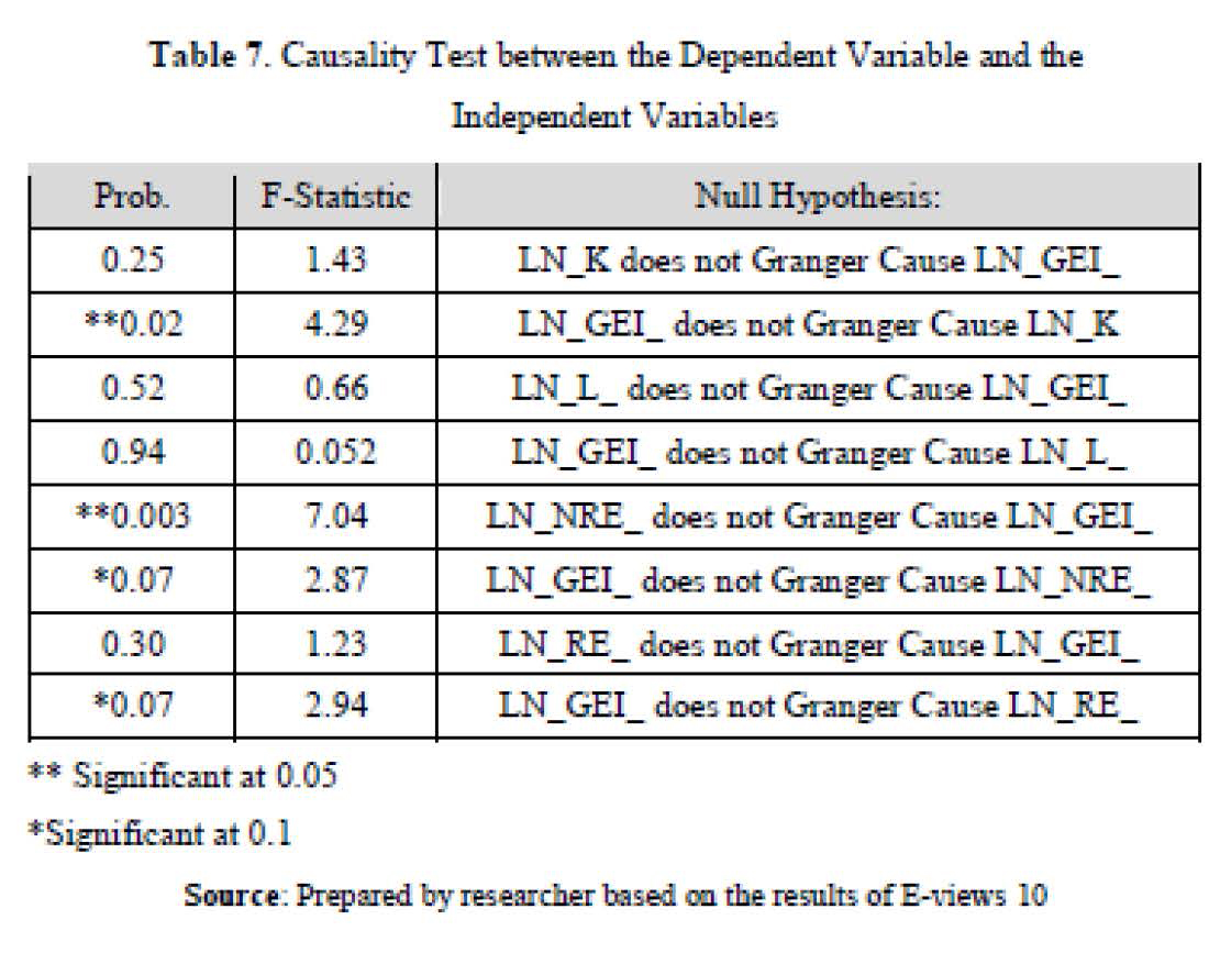 Granger Causality Test is done. Causality in economics refers to the ability of one variable to predict (cause) another variable. This test focuses on the direct relationship between variables and their direction (unidirectional or bidirectional) (Greene, 2017). Using the E-views 10 program reveals (table 7 in appendix) that there is a unidirectional causal relationship between the logarithm of the green economy index and the logarithm of capital at a significance level of 5%, while there is no causal relationship between the logarithm of the green economy index and the logarithm of work at a significance level of 10%. There is a two-way causal relationship between the logarithm of the green economy index and the logarithm of non-renewable energy use at a significance level of 10%. There is a unidirectional causal relationship between the logarithm of the green economy index and the logarithm of renewable energy at a significance level of 10%.
