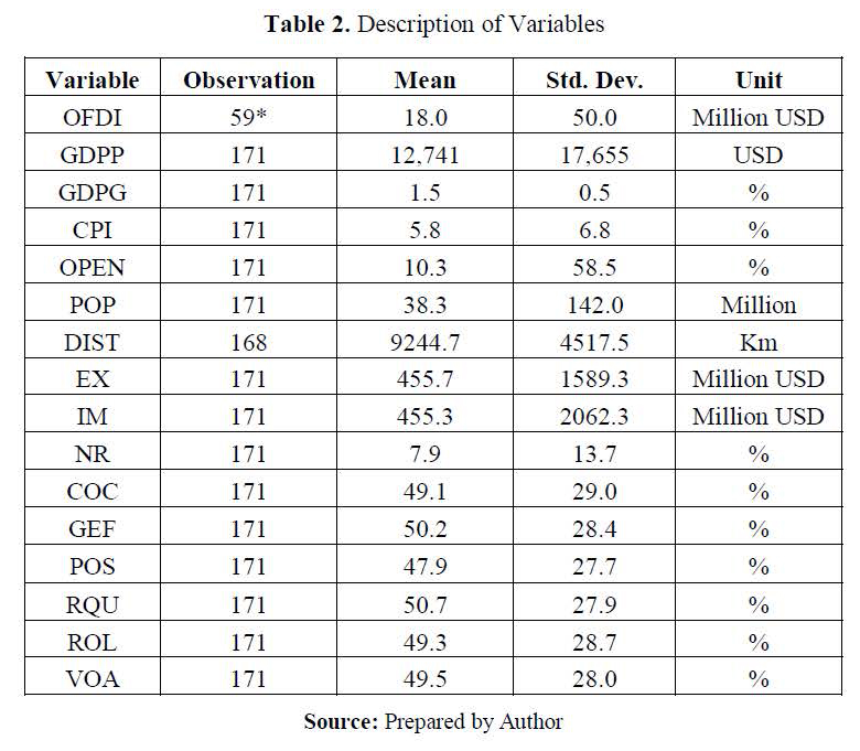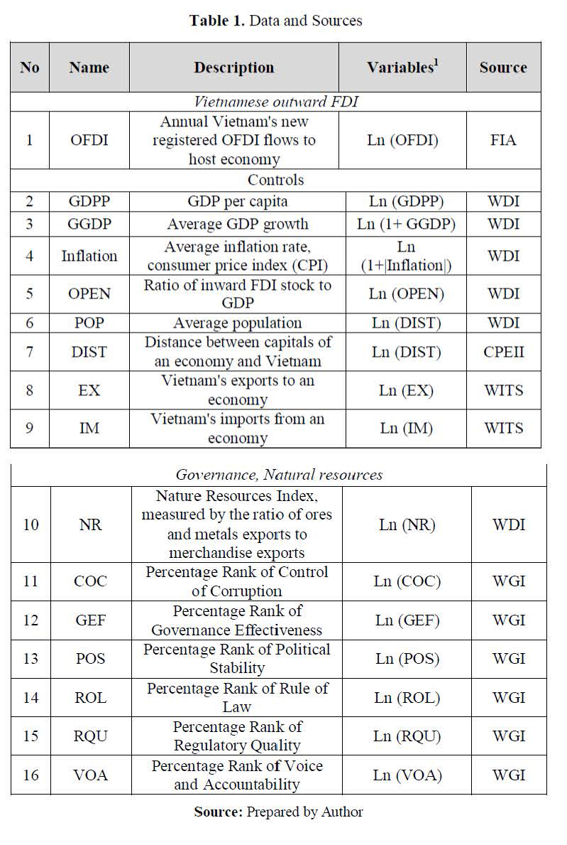 There are four clarifications on our data and methodology for calculating the variables. Firstly, we use three data sources to calculate the Controls: Centre d'Études Prospectives et d'Informations Internationales (CEPII) for the distance variable, World Integrated Trade Solution (WITS) of the WB for the variables on imports and exports, and World Development Indicators (WDI) for the other Controls. Secondly, we calculate our dependent variable, OFDI, as the annual average of new-registered OFDI capital from Vietnam to each country and territory in the world. Data on the new-registered OFDI capital is extracted from FIA data set, which records new OFDI registration licenses during the period of 2007-2021. The measure of new registered capital is employed to reflect the Vietnamese MNCs’ expectations at the starting points of planning their investments abroad. In the period of 2007-2021, Vietnam has registered to invest in 59 countries and five territories (Macao, Hong Kong, Taiwan, British Virgin Islands (BVI), and Camay Islands). Thirdly, for governance variables, we use the WB’s Database on Good Governance to measure 6 sub-indicators: Control of Corruption (COC), Governance Effectiveness (GEF), Political Stability (POS), Rule of Law (ROL), Regulatory Quality (RQU), and Voice and Accountability (VOA) (Kaufmann et al., 2010). Finally, we calculate natural logarithms of (1+ GDPG) and (1+ |Inflation|) as proxies for GDP growth and inflation to run our regressions. A one percentage point increase in (1+ GDPG) corresponds to an increase of one percent in GDP growth (GDPG). In addition, the absolute value of CPI is employed to test a hypothesis that the more stable CPI one country maintains (an inflation rate is near zero), the more motives Vietnamese firms have to invest via OFDI.