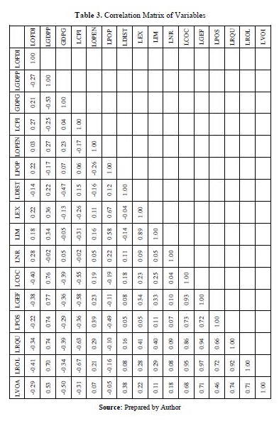 To examine the factors that impact the OFDI amount, we employ the FMOLS estimate to regress Ln (OFDI) with independent variables. In this model, only observations in Vietnamese host countries-or OFDI =1 in probit regressions-are taken into account. Correlation matrix of the variables for this model is presented in Table 3. It can be seen that good governance variables are strongly correlated with each other.