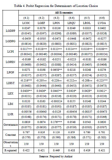 Regarding the determinants of location choice, the probit technique is employed with regressing the binary OFDI variable with Controls, Natural resources, and Governance. Results of six regressions are presented in Table 4.