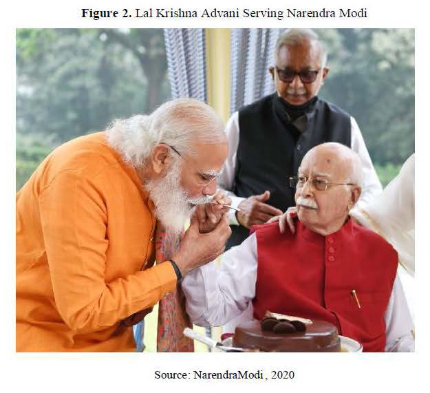 Furthermore, there is no indication of communal-political rallies or BJP slogans in the 2014 election, as in previous elections. Atal Bihari Vajpayee, former prime minister of India under the ruling BJP government and former member of the RSS since 1941, was quoted as saying, "Modi needed to be removed if the BJP was to win national confidence" (Adeney & Saez 2005, p.260). However, in the most recent Lok Sabha election in India, the focus shifted from Modi's economic triumph in Gujarat to the communal unrest that marred the prosperous Indian state under his long rule. Nevertheless, the BJP's position between nationalism and Hindutva allows it to be manipulated to attract Indian votes. However, the party's structural dilemma is whether or not a Hindutva-based party can command a substantial portion of the vote and come to power on its own. The response provided by L.K Advani was negative. Figure 2 shows Lal Krishna Advani Serving a Piece of His Birthday Cake to Narendra Modi, the Prime Minister of India