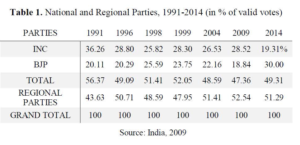 Another BJP ally, the Telugu Desam Party (TDP), declared, "If the BJP chooses to adopt the communal agenda, we will sever ties with it" (Adeney & Saez 2005, p. 249). The subsequent graphs and charts detail the voting patterns of Indians concerning the BJP and its NDA allies. Table 1 shows parties' share of votes between 1991 and 2014.