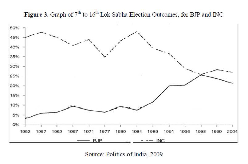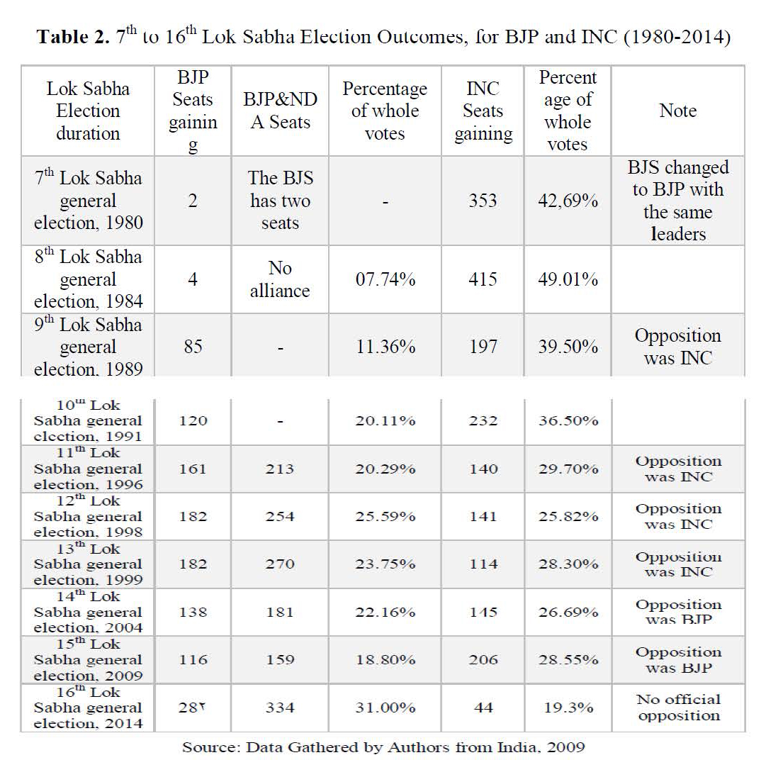Furthermore, the data indicates that Hindu nationalism has recently experienced a surge in popularity (Adeney & Saez 2005, p. 68). As a result, analysts hypothesize that "recent manifestations of Hindu nationalism—such as those that occurred between 1987 and 1993—were the result of various new claimants to political power becoming more assertive and Hindu nationalism's efforts to mobilize and consolidate the Hindu vote" (Rajagopal, 2001, p. 23). The BJP won 282 Lok Sabha seats in the 16th election, an increase from two seats in the seventh Lok Sabha election thirty-five years ago. (India, 2009). Table 2 shows Lok Sabha Election Outcomes for BJP and INC from 1980 to 2014.