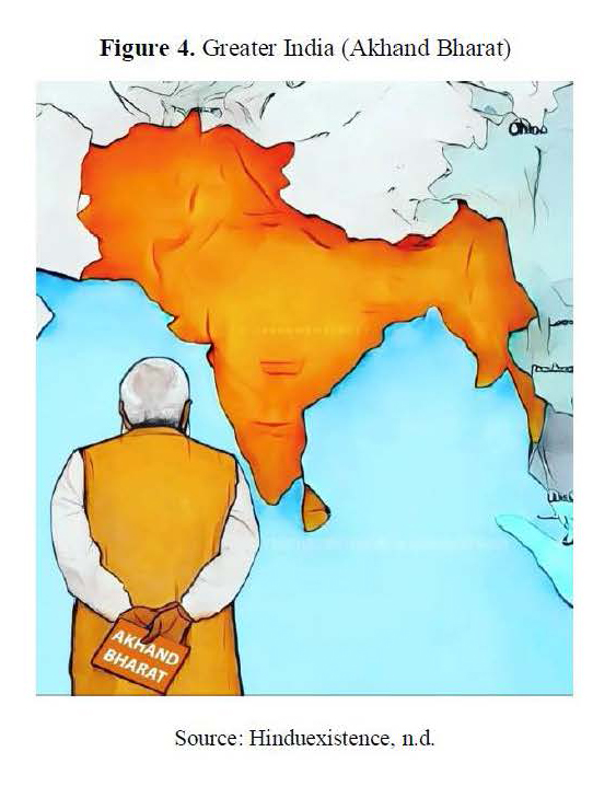 As a result, Hindu radicalism has widespread opposition to the rights and status of minorities to the extent that minority communities have experienced a period of institutionalized discrimination, self-hatred, low self-esteem, low self-confidence, insecurity, and socioeconomic, political, and educational regression. Radical Hinduism possesses the capacity and potential to endanger secular Hindu communities that are diverse, in addition to communities in India and around the world. Hindutva forces are currently conducting anti-minority communal operations in India, which can be viewed as preparation for future endeavors against other majorities around the globe. Hence, certain academics, such as Carrier (Carrier, 2012, p. 1) caution that the world should be prepared to confront Hinduism, that when Hindu nationalism is ascending, not waning, as one of the "world threats," radicalism also has a branch among Indian Hindus, which is expanding and consolidating its influence through the utilization of globalization's capabilities. This poses a threat to the pluralistic, secular, nonviolent democracy of India, the non-radical Hindu faith, and ultimately global peace. Figure 4 shows Narendra Modi, pamphlet in hand, looking at the Greater India (Akhand Bharat) map, including India, Pakistan, Afghanistan, Bangladesh, Myanmar, Nepal, and Sri Lanka with symbolic Saffron color.
