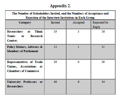 After sending invitation emails – a sample is provided in Appendix 3 - to about fifty representatives of stakeholder groups, the researchers were faced with the limitation of access or the ability to interview in person, especially with the case of trade unions that did not have specific contact channels other than those provided by the Press or Communications sections. As a result, the number of interviewees had to be increased through recommendations by the invitees who were or were not available for the interviews, in addition to further research by the authors – a process that took about a year. Furthermore, to entice the participation of the invitees, the invitation letter was modified to highlight the fact that their comments and responses to the questions will not be directly quoted in the article and their names would be kept confidential.