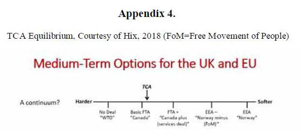 The Trade and Cooperation Agreement (TCA), operational since 21 January 2021, is a 1256-page agreement that was signed between the EU and the UK as a deal that replaced the trading regime under the EU membership. The long-debated agreement, which ended speculations about the post-Brexit framework of trade relations between Britain and the EU, covers many key issues that were meant to resolve divergences in relations and reduce frictions for businesses and people on both sides of the Channel after Brexit (Fusacchia et al., 2022). With the TCA, the UK is out of the Single Market, the Customs Union and all the other trade agreements from which it benefited as a member state – i.e. with third-party countries outside the EU (European Union, 2020). As Fusacchia et al. (2022) posit, the general structure of the deal resembles an Association Agreement or a basic form of FTA, similar to the ones the EU has with several countries neighbouring Europe. Moreover, while the UK officials hoped to achieve a Canada Plus deal and wanted to avoid the no-deal scenario due to its significant costs for the UK economy, in the end, the country had to make a compromise and agree to the TCA, which was also the result of the EU’s compromise from its preferred option – i.e. an EEA or Norway style deal (Hix, 2018, pp. 6-15). This means that the TCA has helped the UK avoid a no-deal, but is still near the hardest Brexit scenarios, - see Appendix 4 – which indicates lower access to the benefits of trading with the EU as a non-member state.
