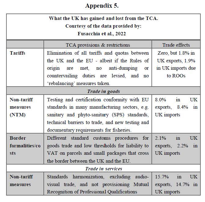 In line with the hypotheses and research questions of this research, impact assessments of the TCA since its implementation day were taken into account to see how this deal has impacted the scope of UK’s trade relations. Various methods of calculation have been taken by five recent studies, – summarized in Appendix 6 - which reveal that not only has leaving the EU not resulted in broadening the scope of the UK-EU trade relations, but it has also brought about a decline in the exports to and the imports from the EU (Aerssen & Spital, 2023). These estimates concur pre-transition studies – those conducted before 31 January 2020 - such as one about the costs of non-tariff barriers on Britain’s trade flows, postulating the prediction that the costs of the NTBs can “match or even outstrip the tariffs” provisions “in some sectors” (Chadwick, 2017). Moreover, looking at the survey conducted by the British Chambers of Commerce, which has involved a diverse range of regions in Britain, it becomes evident that the afore-mentioned estimates and predictions correspond to the actual business and trade happening after the Brexit; as more than 70 percent of the British firms have reported that the TCA has not been helpful in growing their sales, and about half of the goods and services enterprises have complained about the difficulties of “adapting to the new rules”, not to mention the majority of the small and medium-sized enterprises that are facing the biggest challenge in using the UK-EU trade deal (British Chambers of Commerce, 2022).