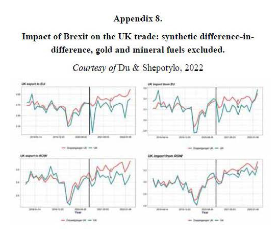 Apart from the detailed studies and reports in relation to the UK’s trade with the EU and non-EU partners, there are studies that have a holistic approach by looking at Britain’s entire global trading networks. One such attempt has investigated the estimated volume of trade under the supposition that the UK did not depart from the EU – i.e. the “Doppelganger UK” – with the actual effects (Du et al., 2022). Comparing the statistics on the UK’s imports from and exports to the EU and the rest of the world (ROW) from the second quarter of 2019 until early 2022, Du et al. argued– as shown in Appendix 8 – that the UK could have arranged better trading relationships with both the EU and the ROW, had the country not left the EU (Du et al., 2023).