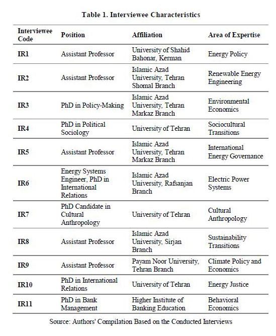 The study conducted 11 semi-structured interviews with leading Iran-based scholars and practitioners representing diverse fields (see Table 1). The interviewees were purposively selected based on their expertise, experience, and influential roles in shaping Iran's energy transition discourse and policy landscape.
