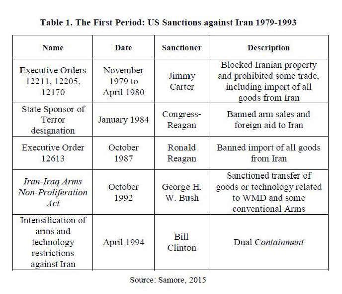 Sanctions, positioned between the extremes of military intervention and diplomatic measures, serve as a pivotal tool in a nation's foreign policy arsenal (Haass, 1998). The evolution of US sanctions against Iran can be delineated into three distinct periods. During the first period, spanning from the onset of the Islamic Revolution through the presidency of George Herbert Walker Bush, the United States unilaterally imposed sanctions against the Islamic Republic in response to events such as the hostage crisis. However, these measures had limited impact on Iran's business partners, primarily comprised of developed European countries.