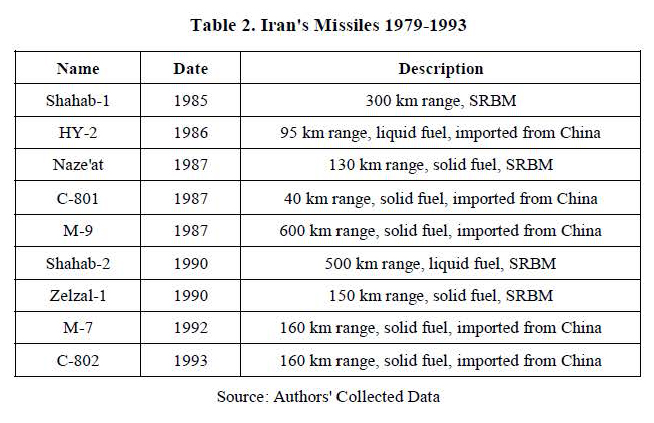 Following the cessation of hostilities, Iran confronted a dearth of weaponry resultant from the war and embarked on initial efforts to procure missile armaments. Recognizing missiles as a means to mitigate the country's immediate military shortcomings and leverage available resources, Iran initiated imports of the Chinese C-801 missile with a range of 150 km in 1989, followed by the acquisition of the C-802 missile with solid fuel in 1993 (George, 1991). Dissatisfied with the performance of these imported missiles and constrained by US sanctions, Iran pivoted towards enhancing its indigenous missile capabilities post-war. In a seminal move, Iran commenced the production of the Shahab-2 and Zelzal-1 (Hamshahrionline, 1391 [2013 A.D.]) missiles in 1990. Notably, this period underscored Iran's efforts to procure missiles from various sources and endeavor to indigenize them through reverse engineering. Table 2 details the types of missiles Iran imported after the revolution and during the Iran-Iraq War. Additionally, this table highlights Iran's initial steps toward developing its own missile capabilities, marking the beginning of its missile program.