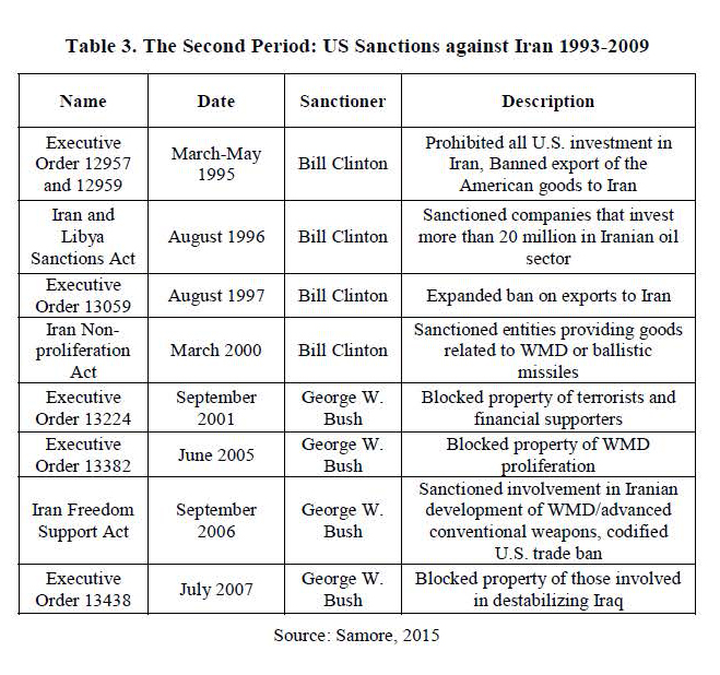 Iran sanctions continued in a more organized form during the Clinton era. During this period, the form of US sanctions underwent a quantitative and qualitative upgrade, getting a cross-border feature in a way that both American and non-American people were (and still are) required to implement them and in case of non-compliance, they would be subject to American sanctions. The first reason for the tightening of sanctions in this period is the increase in tension between the members of the Hamas movement and the Palestinian Islamic Jihad with the Israeli, which was supported by Iran both morally and materially. These tensions led to an increase in the activity of Israeli lobbies in the United States for Washington to put more pressure on Tehran by imposing more sanctions on Iran (Kemp, 1994, pp. 107-108). As depicts in table 3, these provocations finally led to the issuance of executive orders 12957 and 12959 by Bill Clinton in 1995 (Executive Orders 12957, 1995). According to these decrees, trade with Iran and investment in this country by American companies and foreign companies affiliated with them, and participation in the development of Iran's oil projects were prohibited. In order to increase the pressure on Iran and raise the risk of cooperation of other countries with Iran, the Iran and Libya Sanctions Act (ILSA) was approved by Congress in 1996 (Iran and Libya Sanctions Act, 1996). According to this law, any new investments in the oil and gas industry of Iran and Libya were prohibited; this was the starting point for the comprehensive US sanctions on Iran (Katzman, 2005, p. 3). In line with this law, Clinton signed the Executive Order 13059 in 1997 (Executive Order 13059, 1997), which prohibited the export of any type of goods, services and technology by American persons directly or indirectly to Iran.